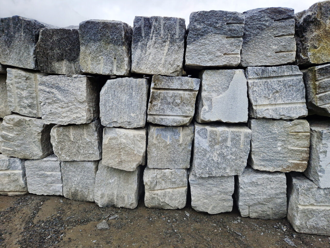 Graue Tessiner Orthokneis wird zu massiven Bausteinen verarbeitet. Die Blöcke sind in den standardisierten Querschnittsformaten 30×30 cm, 40×40 cm, 50×50 cm erhältlich. Die Längen der Blöcke variieren je nach Verwendungszweck 80 – 200 cm.