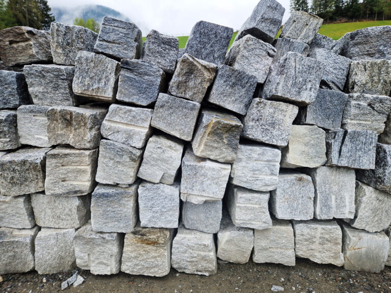 Graue Tessiner Orthokneis wird zu massiven Bausteinen verarbeitet. Die Blöcke sind in den standardisierten Querschnittsformaten 30×30 cm, 40×40 cm, 50×50 cm erhältlich. Die Längen der Blöcke variieren je nach Verwendungszweck 80 – 200 cm.